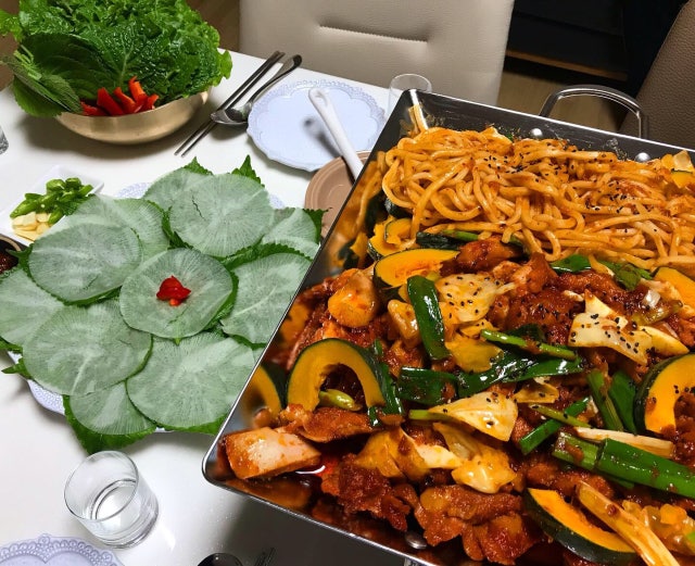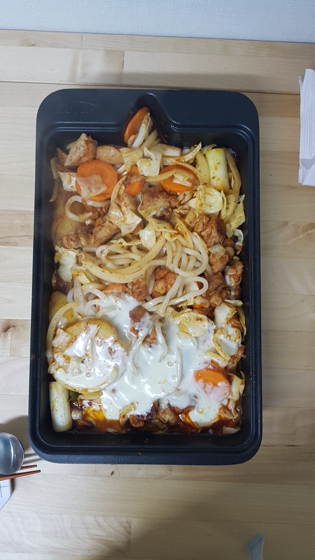 오랜만에 닭갈비 주문해봤어요. 역시 닭갈비가 맛있네요. 매울것같아서 한쪽엔 치즈를 넣어 먹었어요.